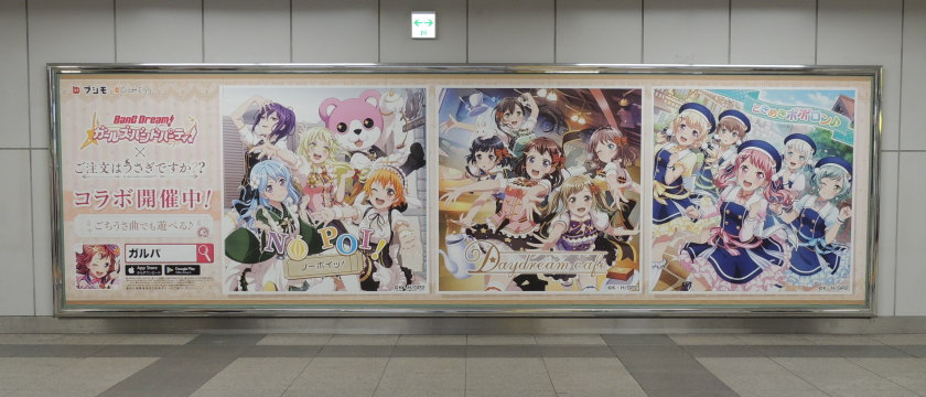 JR秋葉原駅構内(改札内)にて掲示されていた「バンドリ!ガールズバンドパーティ!×ご注文はうさぎですか?? コラボ開催中!」の案内広告です。 |