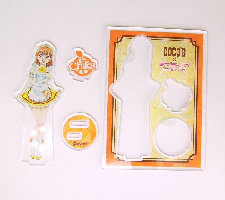 | 高海千歌のアクリルスタンドの構成 この高海千歌のアクスタは、基本的に枠組み、千歌本体、「Aqours」と書かれた円形の台座、「Chika」と書かれたメンバーアイコンの「みかん!」で構成されています。 各パーツは、枠組みに円形のセロテープで貼り付けられていました。 今や、アニメ、コミック、ゲームのキャラクターはアクリルスタンドとして商品化されることが非常に多くなっています。 フィギュアもよいのですが、やはりフィギュアは価格が高いこともあり(プライズ除く)、その点アクリルスタンドは価格はそこそこ手頃であり、基本的には2次元なのですが、キャラの立体感と存在感も感じられ、置き場所もあまり必要なく、本編に登場するキャラのイメージそのままに描き下ろしイラストが使用されて可愛かったりカラーリングが美しかったりするので、最近はアクリルスタンドの需要は高まっているような気もします。 とはいっても、最近はアクリルスタンドの新商品も価格が上がってきているのを実感していて、アクスタの大きさにもよりますが、この高海千歌のように税込で千円以下で買えることは少なくなってきているように思います。 また、実際、最近は中古ホビーショップへ出かけると、以前は見かけなかった、キャラクターのアクリルスタンドのコーナーがショーケース内に設けられていたりすることが多くなりました。 欲しいキャラクターのアクスタがあっても、過去に発売されたもので人気があるものはプレミア価格が付いていたりするので、なかなか悩ましいところです。 |