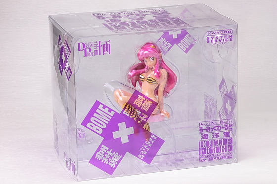 ラムの後姿です。 写真画像をご覧頂いておわかりかと思いますが、ラムの腰掛けているボトルキャップの部分の後ろ側には「C 高橋留美子/小学館 KAIYODO」と記述されています。 また髪の部分がけっこうツヤツヤ、光沢があるのがわかります。 |
