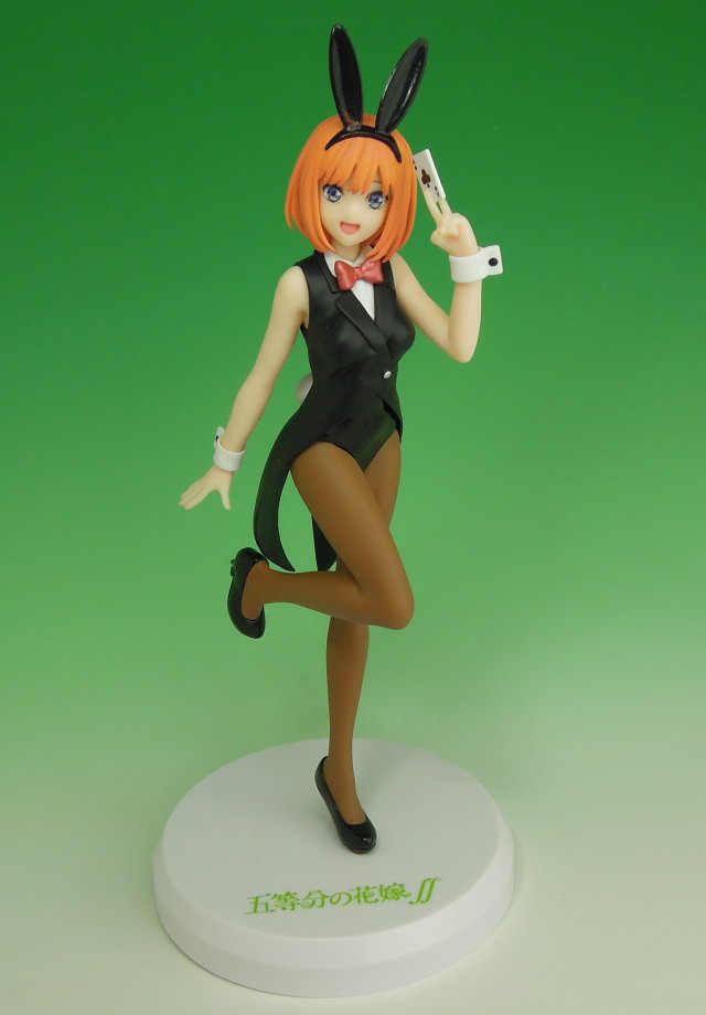 | 五等分の花嫁∬ スーパープレミアムフィギュア “中野四葉” ディーラーVer.(セガ) 2022年7月22日(金)からアミューズメントの景品として順次登場した、「五等分の花嫁∬ スーパープレミアムフィギュア “中野四葉” ディーラーVer.」(セガ)です。 カジノのテーブルゲームで見られる、ゲーム進行役のディーラー(dealer)のスタイルのフィギュアとなっています。 笑顔で元気なポーズの可愛らしいフィギュアで、左手にはトランプのカードのクローバー(クラブ)のエース(A)を持っていますので、カジノの「ブラックジャック」や「ポーカー」、「バカラ」のディーラーがモデルになっているものと思われます。 なお、私が入手したこのフィギュアは、いつ破損したのかはわかりませんが、靴(パンプス)のヒール(かかと部分)が両足とも折れてしまっています。 このフィギュアの靴(パンプス)のヒール(かかと部分)は、けっこう細めですので、取り扱いには注意が必要かと思います。 「五等分の花嫁」関連のフィギュアは、一番くじ、プライズなど非常に多くのバリエーションが登場していて、すべてを網羅するのはとても難しいのではないか、と思われます。 登場時期 2022年7月22日(金) 全1種 全高 約23cm 2024.04.10現在 |