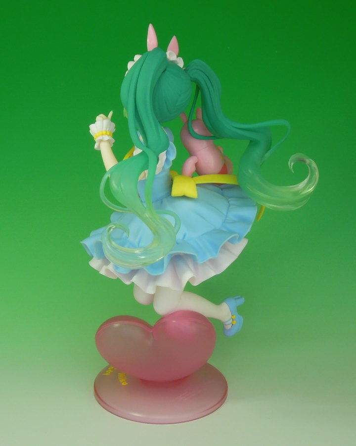 | 初音ミク×Rody AMP+ フィギュア 〜メルヘンver.〜(タイトー) 2025年7月下旬にアミューズメント専用景品(PRIZE ONLY)として順次登場した、「初音ミク×Rody AMP+ フィギュア 〜メルヘンver.〜」(タイトー)です。 ロディ誕生39周年を記念して初音ミク(39)とコラボした、タイトーの最上級フィギュアブランド「AMP+」(ARTIST MASTERPIECE+)のフィギュア「初音ミク×Rody AMP+ フィギュア 〜39/サンキューver.〜」が2024年2月下旬に登場していますが、それに続いて今回は「メルヘン」がイラストテーマのNEWアートとしてフィギュア化されたものです。 前回登場したフィギュア「初音ミク×Rody AMP+ フィギュア 〜39/サンキューver.〜」と同様に、このフィギュアは、イラストレーター「4」氏がデザインをてがけたフィギュアとなっているようで、パッケージと台座にはそのことを示すように「Art by 4」と記されています。 パッケージ側面には、このフィギュアの元となったと思われる可愛らしいイラストが描かれています。(下方掲載の写真参照) ミクはふわっと広がる衣装にロディとお揃いの耳と尻尾が可愛らしく、ロディもミクの髪飾りと同じステラ(星)のマークがチャームポイントとなっているようです。 ミクの履く靴のヒールの底(トップリフト/化粧革)がハート形になっているところも、とても可愛らしいです。 円形の台座には大きなハートマークが造形され、「Hatsune Miku × Rody」と書かれています。 ちなみに、「RODY」(ロディ)は、1984年2月14日にイタリア北部のオソッポ村にある「レードラプラスティック社」で誕生した、馬をモチーフにバランスボールテクノロジーを応用して作られた乗用玩具となっています。 タイトーのプライズフィギュアの最上級ブランド「AMP+」の商品とはいえ、プライズレベルでこの可愛らしい造形と出来栄えであることが素晴らしいと思います。 女性の方でも、初音ミクが好きな方は、このフィギュアを室内のインテリアのひとつとして飾って置いていても、柔らかく優しさを感じさせるパステルカラー系のフィギュアが、可愛らしい「癒し」のアイテムのひとつとなり得るのではないでしょうか。 なお、このフィギュアは同時期に、カラーリングが異なるバリエーションの「タイクレ限定」(タイトーオンラインクレーン限定)も登場しています。 登場時期 2025年7月下旬 全1種 サイズ 約17cm ※台座含むと約21cm 2025.09.08現在 |