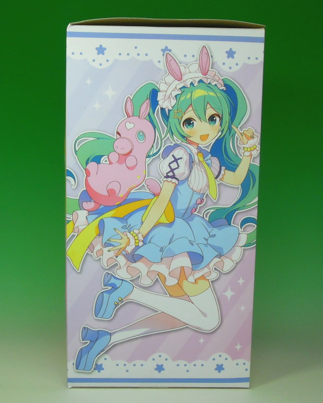 | 初音ミク×Rody AMP+ フィギュア 〜メルヘンver.〜(タイトー) パッケージ このフィギュアは、イラストレーター「4」氏がデザインをてがけたフィギュアとなっているようで、パッケージにはそのことを示すように「Art by 4」と記されています。 そして、パッケージ側面には、このフィギュアの元となっているミク×Rodyのイラストが描かれています。 また、パッケージには、台座が付属することが書かれています。 パッケージの大きさは、高さ(H)が約220mm、幅(W)が約130mm、奥行(D)が約115mmとなっています。 |