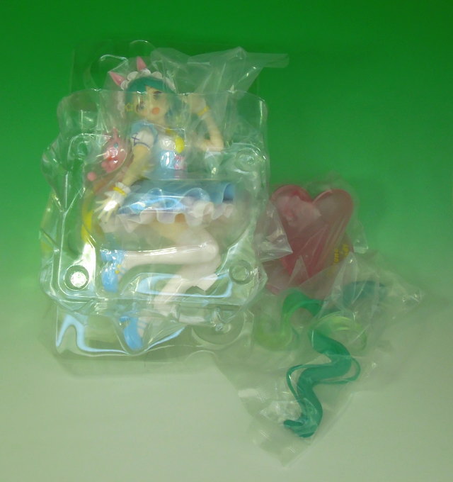 | パッケージ内の包装の様子 パッケージ内には、透明なビニールシートに包まれたミク×Rodyのフィギュア本体がブリスターパックされたもの、それにビニール袋に入ったミクのツインテールのパーツ2個と、大きなハート形が造形された台座が入っています。 このフィギュアを飾ったりしたい場合には、これらのパーツを自分で組み立てる必要があります。 一般的なプライズフィギュアは、足の裏(足底)にある凸部を台座に差し込むケースが多いですが、このフィギュアはミクの左足の脛(すね)にある凸部を台座のハート形部分に差し込むようになっています。 |