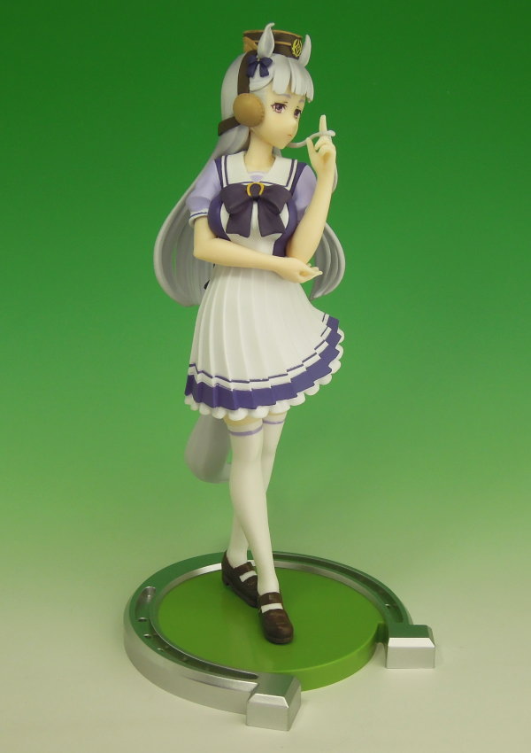 | ウマ娘 プリティーダービー ゴールドシップ フィギュア(バンプレスト) 2022年6月29日(水)からアミューズメントの景品として順次登場した、「ウマ娘 プリティーダービー ゴールドシップ フィギュア」(バンプレスト)です。 髪の毛を左手の指に絡めたしぐさのトレセン学園制服姿でのフィギュア化で、蹄鉄形の特製台座が付属しています。 本物のゴールドシップ(Gold Ship)は、2011年7月9日(デビュー)から2015年12月27日(有馬記念 最終出場競馬)まで現役だった牡馬(オス)で、主な勝ち鞍(かちくら/優勝したレース)は、皐月賞(GT/2012年)、菊花賞(GT/2012年)、有馬記念(GT/2012年)、宝塚記念(GT/2013年・2014年)、天皇賞[春](GT/2015年)などとなっていて、生涯成績は28戦13勝(うちGTは前述の6勝)、獲得賞金は13億9776万7000円となっています。 「ゴールドシップ」は、阪神競馬場で8戦6勝と好成績をおさめたことから「阪神巧者」とも呼ばれることがあるそうです。 (以上のデータはWikipedia参照) 登場時期 2022年6月29日(水) 全1種 約19cm 2024.01.07現在 |