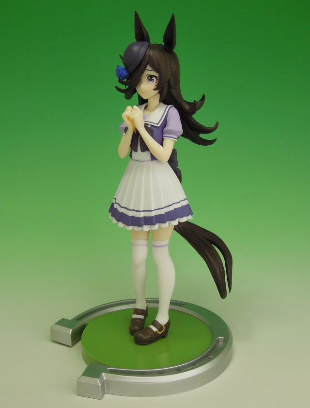 | ウマ娘 プリティーダービー ライスシャワー フィギュア(バンプレスト) 2022年7月26日(火)からアミューズメントの景品として順次登場した、「ウマ娘 プリティーダービー ライスシャワー フィギュア」(バンプレスト)です。 公式イラストにも採用されている、両手を前に合わせた仕草のトレセン学園制服姿でのフィギュア化で、蹄鉄形の特製台座が付属しています。 本物のライスシャワー(Rice Shower)は、1991年8月10日(デビュー)から1995年6月4日(宝塚記念 最終出場競馬)まで現役だった牡馬(オス)で、主な勝ち鞍(かちくら/優勝したレース)は、菊花賞(GT/1992年)、天皇賞[春](GT/1993年・1995年)、日経賞(GU/1993年)などとなっていて、生涯成績は25戦6勝、獲得賞金は7億2949万7200円となっています。 「ライスシャワー」は、菊花賞では「ミホノブルボン」のクラシック三冠制覇を阻止し、1993年の天皇賞(春)では「メジロマックイーン」の同競争三連覇を阻止したという、人々の記憶に残るレースをみせたそうです。 (以上のデータはWikipedia参照) 登場時期 2022年7月26日(火) 全1種 約16cm 2024.02.10現在 |