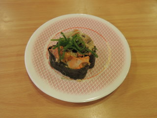 ローストポーク軍艦 1皿は現在、税込で¥108円。 2018.02.11現在 |