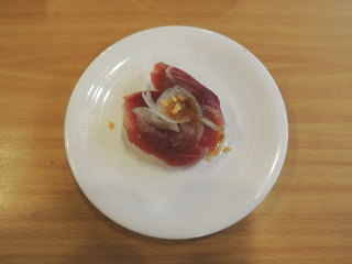 | まぐろ二種盛り 「まぐろ」と「びんちょう」で、1皿は現在、税込で¥108円。 2017.09.16現在 |