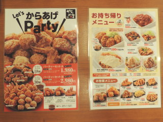 お持ち帰りメニューには、各種お弁当、から揚げ、手羽先、なんこつなどをはじめ、パーティーセットも用意されていました。 2018.08.25現在 |
