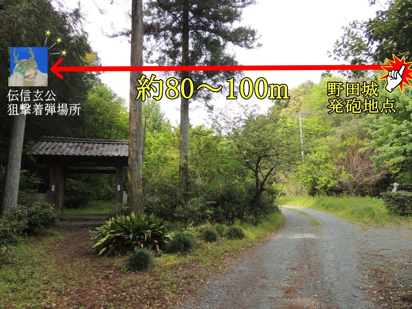 | 野田城本丸から伝信玄公狙撃着弾場所までの距離を考える 上の写真は、野田城跡の西側にある法性寺(ほっしょうじ)入口付近の風景を南側から撮影したものです。 なお、写真左側に見える門は、現在の法性寺にある大門(だいもん)で、1719年(享保4年)に野田城の本丸にあった門を移築したものなのだそうです。 野田城の戦いの当時は、この場所に法性寺は無く(1658年建立)、当時は「龍渕」と呼ばれ、自然の川をせき止めて堀を形成していたそうです。 写真を見てわかるとおり、かつて龍渕と呼ばれ自然の堀とされていたこの場所は、東西両側(写真の左右両側)を急斜面の崖で挟まれ、野田城の守りを固くしていたことがわかります。 写真左上あたりの崖の上が伝信玄公狙撃着弾場所で、右上のほうの崖の上が野田城本丸内の信玄公狙撃場所とされる地点です。 上記2地点間の距離を「Googleマップ」で測ってみると、おおむね約80mから約100m程度となるようです。 一般的に、火縄銃の命中率が高いのは距離50m以内、有効射程距離(修正して狙って当てることができ、なおかつ殺傷効力のある距離)は50mから約100mといわれ、銃の角度を上方に向ければ、最大で約500mは銃弾が届くそうです。 歴史群像編集部と日本前装銃射撃連盟の方々による2005年頃に行われた火縄銃の射撃実験では、30m先の人物を模した高さ160cmの的に発射した5発全弾が胸部に命中、50m先の的では発射した5発中4発が命中したそうで、貫通威力も十分だったそうです。 しかし、火縄銃は、銃身内にライフリング(らせん状の溝)が施されて銃弾の安定・直進性が高められている現代の銃と異なり、銃身内が平らな滑腔銃身で、なおかつ銃弾が丸玉となっているため、50m以上の距離になると、弾道が安定しにくくなり、命中率が落ちるようです。 現在語られている、伝信玄公狙撃着弾場所と鳥居三左衛門狙撃地点の距離は約80mから約100m程度となっていますので、修正して狙って銃弾を命中させることができ、なおかつ相手を殺傷可能といわれる火縄銃の有効射程内に、なんとかおさまっています。 伝えられるところによると、笛の音色を聴くために堀端まで接近してきた信玄は、竹に紙を付けた場所に来たようで、それが目印となってしまったようです。 武田軍は、夜中はかがり火を焚いて周囲を明るくして警戒していたそうなので、かがり火の明かりで、野田城内から少しは人の動きが見えた可能性があります。 また、夜中に笛を聴いていたとなると、信玄はリラックスしていて、鎧兜を身に付けていた可能性は低いかもしれません。 もし、鳥居三左衛門が、長年の経験で、銃の角度をはじめとするこの距離での狙撃方法を知っていて、予め狙いを定めて火縄銃を設置して、本当に狙いどおり対岸とも言える場所に居る人物に銃弾を命中させたのであれば、鳥居三左衛門は、戦国時代の超一流スナイパー「ゴルゴ13」(さいとう・たかを氏原作・著作)として語られてもよいと思います。