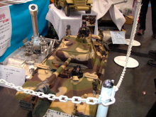 左側が87式偵察警戒車、真ん中が偵察オートバイ、右側が74式戦車です。陸上自衛隊の各駐屯地祭へ行くと74式戦車や90式戦車などの体験試乗(実際に走行します)ができる場合があります。富士学校が新装備が見られるのでオススメです。わたしは74式戦車の砲塔内に乗って試乗したこともあります。 |