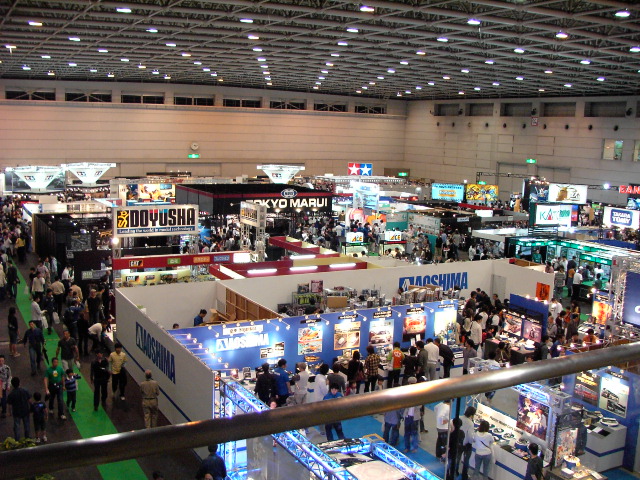 主にラジコン以外のプラモデル、鉄道模型、エアガンを取り扱うメーカーが出展している北大展示場の様子を2Fレストラン部から展望したものです。 |