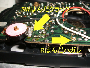 【写真4】 基板をはずすためにボリュームと選局のツマミをはずそうとしたのですが、両面テープで取り付けてあるツマミのカバーをはずして中のネジをはずさないととれない事がわかりました。 基板を見てみると、はんだ付けの技術が低かった様で、SW付VRのはんだクラックとR17のはんだのヤニが溶けきれてなかったのか浮いていました。 全てのはんだ付けをチェックして修理を完了すると、とても元気に鳴り始めました! どうやら音質が悪かったのも出力段のR17が導通していなかったためらしく、音質もとても良くなりました。 でも直したラジオで高校野球を聴いていたらひいきの高校負けてしまいました…(ノ_-。) |