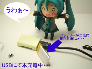 【写真3】 USBで充電できる電圧まで上がったので、USBで本充電をしてみると…バッテリーパックがお餅の様にふくらんできました。(写真ではわかりにくいですが…) これこそがネットで「candi」がよく壊れると言われる原因なのです! その理由とは、このバッテリーパックを包む銀色のシールドの膨らむ力はすさまじく、メモリーの配線、コントロール基盤を圧迫して破壊してしまうことが分かりました。(充電終了後、プレイヤーは無事動作しました。) |