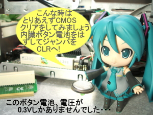 【写真4】 こういう時、一番簡単な解決方法はマザーボードのCMOSクリアを実行することです。 マザーボード上のボタン電池をはずし、CMOS CLRと書いてあるジャンパを反対側に差し替えて、3分ぐらい経ったらジャンパを元に戻し、ボタン電池を入れ直せばOKです。 この時、はずしたボタン電池の電圧は必ず測定しておいたほうがいいです。 今回はずしたボタン電池はたった0.3Vしかなく、あたりまえですが交換しておきました。(ひどいボタン電池だと2年ぐらいで電圧降下して起動に問題が発生することがあります。) |