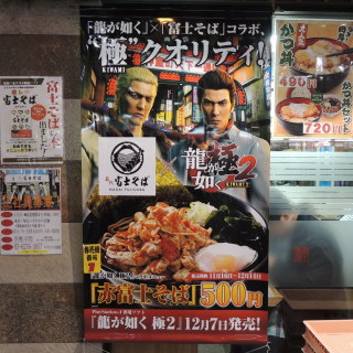 | 「龍が如く」×「富士そば」 「名代 富士そば 秋葉原電気街店」にて掲示されていた、「龍が如く」×「富士そば」コラボの広告ポスターです。 2017年12月7日(木)に発売予定の「PlayStation4」専用ゲームソフト「龍が如く 極2」(セガ)とのコラボメニューとして、「赤富士そば」が¥500円で、11月16日~12月14日まで販売されているようです。 2017.12.02現在 |