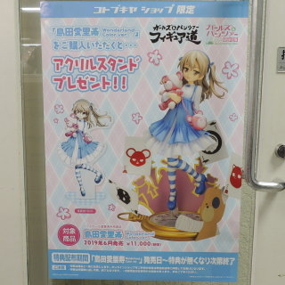 コトブキヤショップ限定 島田愛里寿 Wonderland Color ver. 「アクリルスタンド」プレゼント 「コトブキヤ秋葉原館」に掲示してあった「島田愛里寿 Wonderland Color ver. アクリルスタンドプレゼントキャンペーン」の広告ポスターです。 このフィギュアは、「フィギュア道第1弾」として発売された島田愛里寿が「Wonderland Color」となって再登場するもので、服の色味変更に加え、台座の造形や表情の変更、新規造形パーツの追加がなされているそうです。 1/7スケールで、2019年6月発売予定、価格は¥11,000円(税別)となっています。 ポスターで案内されているように、「コトブキヤショップ」購入限定特典で、島田愛里寿の「アクリルスタンド」(写真のポスターの左側。全高約10cm)が1個もらえるようです。(無くなり次第終了) 2019.01.19現在 |