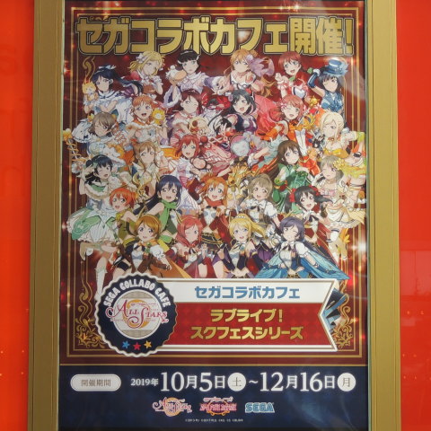 | セガコラボカフェ ラブライブ!スクフェスシリーズ 「セガ秋葉原 4号館」の1階に併設されている「セガコラボカフェスタンド」に掲出されていた「セガコラボカフェ ラブライブ!スクフェスシリーズ」の案内ポスターです。 開催期間は、2020年7月25日(土)~10月11日(日)までとなっています。 2020.09.28現在 |