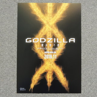 映画「GODZILLA 星を喰う者」 「ゴジラ」の初の長編アニメーション映画「GODZILLA」の最終章となる第3章「GODZILLA(ゴジラ) 星を喰う者」の案内広告チラシです。 第1章「GODZILLA 怪獣惑星」は、2017年11月17日(金)から上映が開始され、第2章「GODZILLA 決戦機動増殖都市」は2018年5月18日(金)から公開が開始されています。 第3章となる最終章「GODZILLA 星を喰う者」は、2018年11月公開予定で、劇場購入前売券には特典として「特製ギドラクリアファイル」(各劇場数量限定)が付属するようです。 2018.06.05現在 |