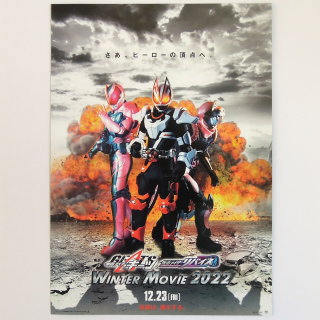 映画「仮面ライダーギーツ×仮面ライダーリバイス WINTER MOVIE 2022」 2022年12月23日(金)に公開予定の映画「仮面ライダーギーツ×仮面ライダーリバイス WINTER MOVIE 2022」の案内広告チラシです。 広告チラシに書かれたキャッチコピーは「さあ、ヒーローの頂点へ。」となっています。 2022.09.24現在 |