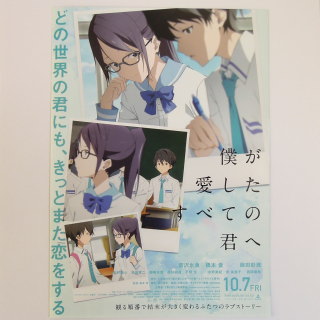 | 映画「僕が愛したすべての君へ」、「君を愛したひとりの僕へ」 2022年10月7日(金)に2作同日公開予定の映画「僕が愛したすべての君へ」(上)と映画「君を愛したひとりの僕へ」(下)の案内広告チラシです。 ![]() TikTokで話題の小説が映画化されたもので、2作同日公開となっていて、観る順番で結末が大きく変わるふたつのラブストーリーとなっているようです。 広告チラシに書かれたキャッチコピーは「どの世界の君にも、きっとまた恋をする」となっています。 2022.09.24現在 |
