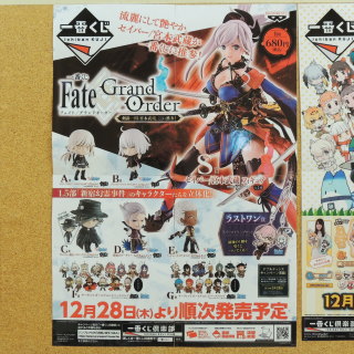 一番くじ Fate/Grand Order 剣轟一閃-宮本武蔵、ここに推参! 「一番くじ Fate/Grand Order」(フェイト・グランドオーダー)の広告ポスターです。 2017年12月28日(木)から順次発売予定で、くじは1回¥680円(税込)、S賞は「セイバー/宮本武蔵フィギュア」となっているようです。 2017.12.02現在 |