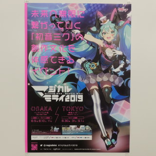 マジカルミライ 2019 「秋葉原ラジオ会館」内に掲示してあった「マジカルミライ 2019」の案内広告ポスターです。 ポスターには「未来へ無限に繋がっていく『初音ミク』の創作文化を体感できるイベント!」と書かれています。 初音ミクたちバーチャル・シンガーの出演するライブと、ワークショップなどの体験や展示・物販・企業出展ブースなどのイベントが実施される企画展が開催される予定です。 大阪では「インテックス大阪」(大阪市住之江区)にて、ライブが2019年8月10日(土)・11日(日)に、企画展が2019年8月9日(金)~11日(日)にそれぞれ開催予定です。 東京では「幕張メッセ」にて、ライブおよび企画展が2019年8月30日(金)~9月1日(日)まで3日間、それぞれ開催予定です。 詳細は公式サイトをご確認ください。 2019.05.04現在 |