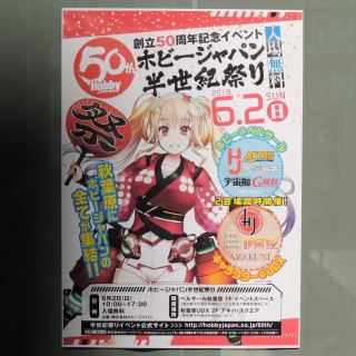 | 創立50周年記念イベント ホビージャパン半世紀祭り 秋葉原にて掲示されていた「創立50周年記念イベント ホビージャパン半世紀祭り」の案内広告ポスターです。 2019年6月2日(日)10:00~17:00に、秋葉原の「UDX」と「ベルサール」の2会場において同時開催予定で、入場無料となっています。 「秋葉原UDX」の会場では、ステージ、ギャラリー、アニメコーナー、フィギュア展示、物販の各コーナーが用意され、「ベルサール秋葉原」の会場では、ステージ、特設ギャラリー、工具体験・実演販売、モデラ―実演、作例展示、表紙撮影体験、エアガン射撃体験、ライブペインティング、カードゲームかるた、物販の各コーナーが用意される予定のようです。 イベント内容の詳細は「ホビージャパン」の公式サイトをご確認ください。 2019.05.25現在 |