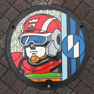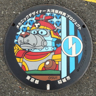マグナムエース 疾風!アイアンリーガー JR南武線「矢野口駅」北口側に設置されていた「疾風!アイアンリーガー マグナムエース」デザインの、カラーのマンホール蓋です。 外周部には、「メカニックデザイナー大河原邦男プロジェクト」、「©サンライズ」、「東京都稲城市」と刻印され、最下部のほうには「OSUI」(汚水)と書かれています。 また、今回設置されたアニメのメカ系4種のマンホール蓋(大河原邦男氏デザイン)の右側には、稲城市章が配され、稲城市の北側を流れる多摩川、三沢川、大丸用水をイメージした3本の青色系の縦の線がデザインされ、下部には緑色と茶色を使用した豊富な緑と自然(武蔵野平野)をイメージしたデザインが施されています。