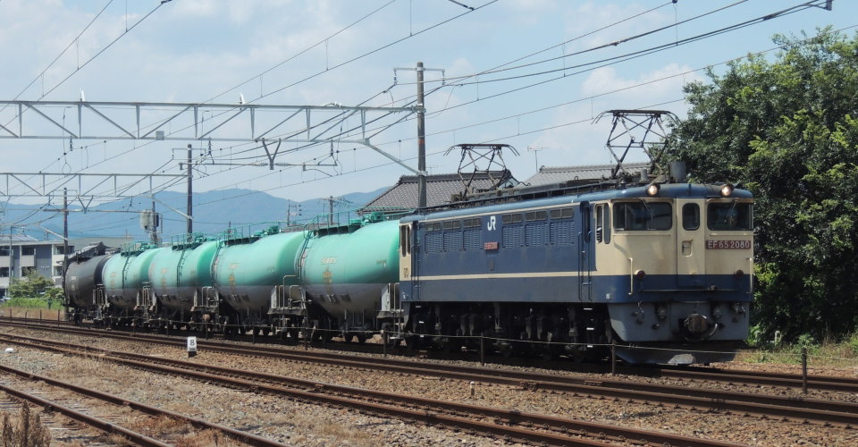| EF65-2080+タキ5両(8862レ) 愛知御津→西小坂井 東海道本線(上り線/JR東海)の愛知御津~西小坂井間を西小坂井駅方面(豊橋・浜松方面)へ行く、EF65-2080[新鶴見]+タキ5両(8862レ[EF65新鶴見 A862]・稲沢→川崎貨物)です。 この日の8862レは、EF65-2080号機の次位から、タキ243760、タキ243861、タキ1000-948、タキ1000-56、タキ243661(黒タキ)を連結して稲沢から川崎貨物駅まで向かったようです。 下の写真は、8862レが西小坂井駅(上り1番線/待避線)に停車中の様子を野地踏切から撮影したものと、今回、最後尾に連結されて輸送されたタキ243661(黒タキ)の様子を撮影したものになります。 なお、EF65-2080号機は、昨日の2024年7月21日(日)に単機で川崎貨物から静岡貨物まで走行し(8863レ~9863レ)、静岡貨物駅からはチキ2両(チキ7052+チキ7051)を連結して稲沢まで走行(9863レ)しています。 2024.07.22(Mon)[12:16]現在~天気は時折雲が見られる晴れ |