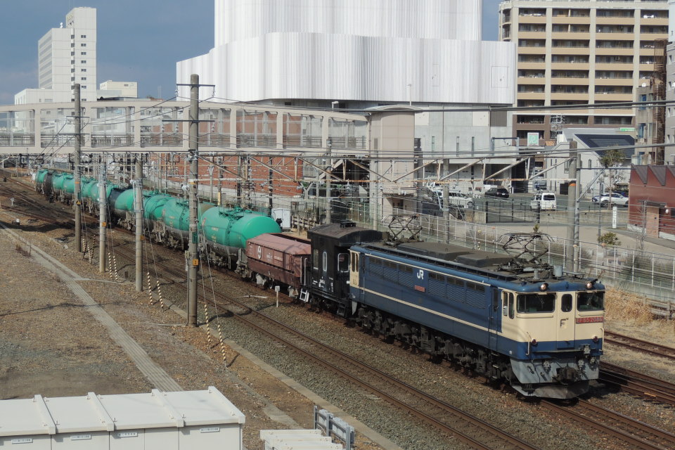 | EF65-2086+ヨ8404+ホキ1両+タキ10両(8862レ) 豊橋→二川 豊橋駅の東海道本線6番線(上り線/JR東海)を通過して二川駅方面(浜松・静岡方面)へ行く、EF65-2086[新鶴見]+ヨ8404+ホキ2000-27(石灰石専用)+タキ1000-307+タキ1000-203+タキ1000-809+タキ1000-951+タキ1000-245+タキ1000-953+タキ243727+タキ243718+タキ243675(黒タキ)+タキ243755(8862レ[EF65新鶴見 A862]・稲沢→川崎貨物)です。 豊橋駅の南方(浜松・静岡方)約500mあたりのところにある花田跨線橋にて撮影。 昨日の2025年2月16日(日)に8863レ~9863レでタキ5両を川崎貨物駅から稲沢まで牽引したEF65-2086号機は、翌日の本日2月17日(月)に8862レにて上記の車掌車ヨ8000形、貨車のホキ2000形(1両)およびタキ10両を牽引して首都圏へ帰って行きました。 8863レや9863レ、8862レは、たまにこのような興味深い編成で運転されるので、ファンにとっては楽しみな貨物列車となっています。 現時点では、2025年3月15日(土)のダイヤ改正により、8863レや9863レ、8862レの牽引機がどうなるのか注目されます。 2025.02.17(Mon)[12:54]現在~天気は曇り時々晴れ(撮影時はたまたま晴れ間。午後はおおむね晴れ) |