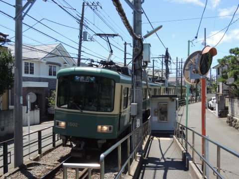 | 1500形+500形(上り・藤沢方面行) 鵠沼駅方面(江ノ島・鎌倉方面)から柳小路駅(単式ホーム)に接近中の、1500形(1502F・2両編成)+500形(501F・2両編成)「藤沢」行です。 柳小路駅の単式ホーム南端寄り(鵠沼・鎌倉寄り)にて撮影。 2018.06.29現在 |