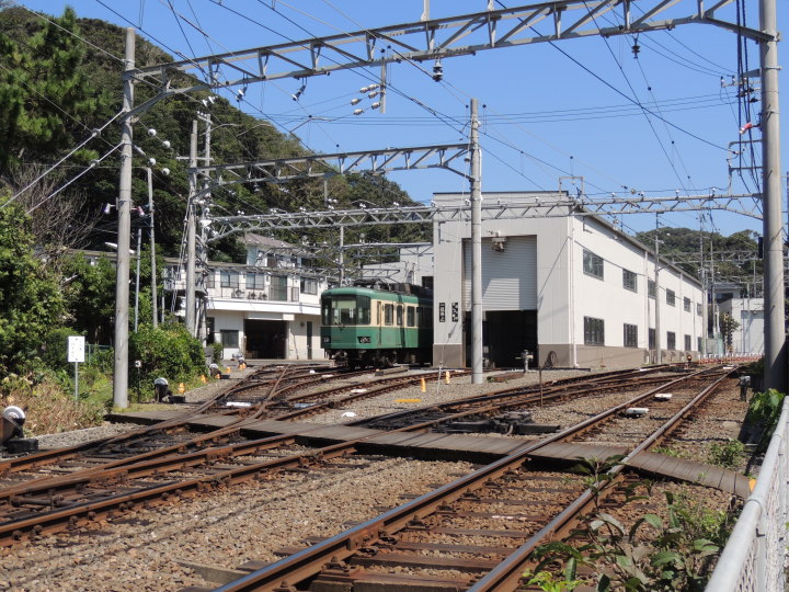 | 江ノ電 極楽寺検車区 江ノ電の稲村ヶ崎駅と極楽寺駅の間にある極楽寺検車区です。 位置は、稲村ヶ崎駅の北東約700m、極楽寺駅の南西約150mのところにあります。 上の写真では、検車区構内に留置されている1000形(1002編成)と思われる車両が見えています。 極楽寺検車区は江ノ電が有する唯一の検車区及び工場のようで、線路は6本有り、夜間には列車が留置されるようです。 上の写真は、極楽寺検車区を南側から撮影したもので、写真左側が稲村ヶ崎駅方面(江ノ島・藤沢方面)、写真右奥側が極楽寺駅方面(鎌倉方面)になります。 2013.09.01現在 |