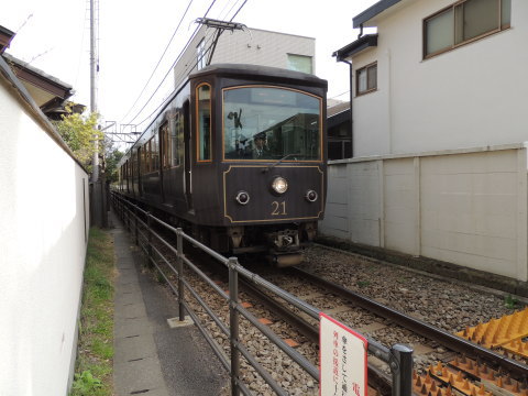 江ノ電 20形+500形 和田塚~由比ヶ浜間を由比ヶ浜駅方面(江ノ島・藤沢方面)へ行く、20形(21編成)+500形(502編成)「藤沢」行(4両編成)です。 和田塚駅の約100m西方(江ノ島・藤沢方)のところにある「由比ヶ浜3号踏切」にて撮影したもので、写真手前側が由比ヶ浜駅方面(江ノ島・藤沢方面)になります。 2013.11.09現在 |