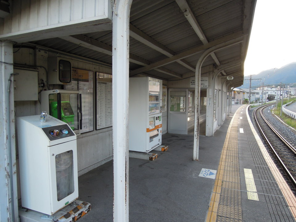 | 伊那上郷駅のホーム上にある待合所の様子 待合所は比較的大きく立派で、自動販売機や公衆電話、空き缶・ペットボトル回収箱まで設置されています。 屋根部分も長く造られていて、高校生の下校時などの混雑時に極力対応できるように配慮されているものと思われます。 |