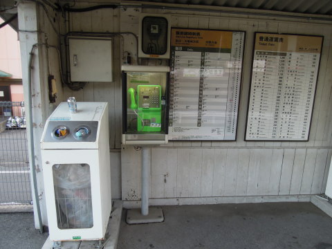 待合所に設置された公衆電話など (←写真左) 公衆電話の他、空き缶・ペットボトル回収箱も設置され、壁面には時刻表と普通運賃表が掲示されています。 時刻表を見てみると、朝夕の登下校時間帯の列車本数は、1時間に1本、よくて2本しかないようですので、乗り遅れたらかなりの時間をロスすることになりそうです。 このようなこともあって、下山村駅からここ伊那上郷駅へ自らの足で向かう「下山ダッシュ」の逸話が生まれたのかもしれません。 |