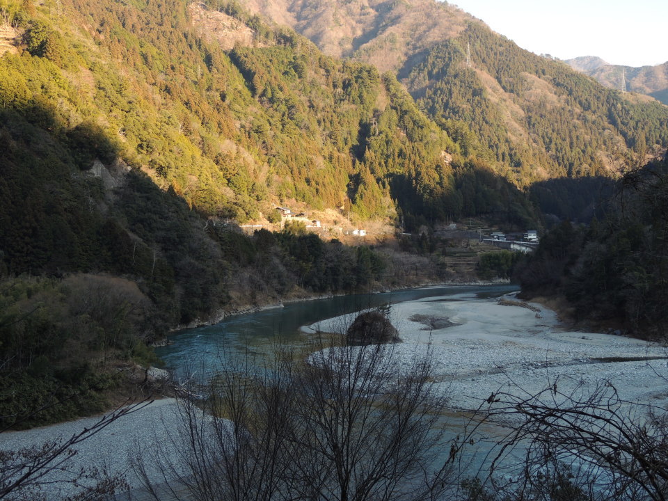 | 天竜川に架かる水神橋(すいじんばし) 伊那小沢駅の南方約200mあたりの天竜川に架かる水神橋(すいじんばし)です。 伊那小沢駅の西側を流れる天竜川の右岸を通る長野県道1号飯田富山佐久間線から撮影したもので、上の写真の水神橋の左上奥のほうに伊那小沢駅が小さく見えています。 写真右上のほうの山の斜面には、ちょっとした集落が見えています。 中井侍駅の南西約1.3kmあたりの天竜川に架かる橋の名前が平神橋(へいしんばし)で、ここに架かる橋の名前が水神橋(すいじんばし)ということで、両方とも橋の名前に「神(かみ)」が付いていて、このことから、この地域の天竜川沿いに住まわれる方々が、いかに自然の神様を大切に思い信仰してきたかがわかるような気がします。 |