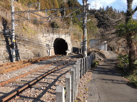 伊那小沢駅の中井侍方にある小沢トンネル 伊那小沢駅の南東側(中井侍・豊橋方)には「小沢トンネル」(62/長さ 393m)があります。 写真右奥のほうの、小道の左側に見える小屋のようなものが建っている場所が貨物ホーム跡と思われる場所になります。 |