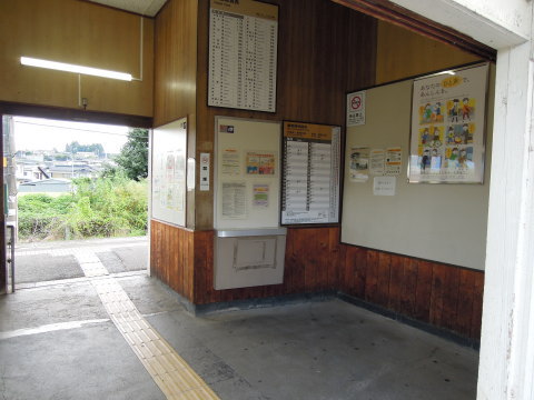 | 駅舎内部の様子 駅舎内部の様子を、駅舎出入口付近から撮影したものです。 写真左奥がかつての改札口で、奥のほうへ行くとホームへ出ることができます。 写真右側に見えるかつての窓口・きっぷ売場は、現在は閉鎖されています。 鼎駅は、2013年(平成25年)4月1日に窓口が廃止されて、現在のような無人駅となっています。 壁面には、時刻表と普通運賃表が掲示されています。 |