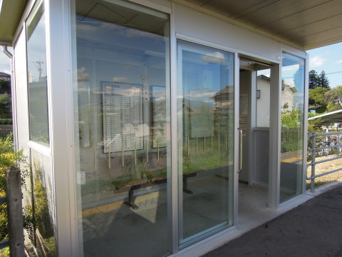 | 毛賀駅の待合所の様子① ホーム上の待合所は、ガラス部分の面積が大きく、出入口にドアも付いた密閉型の待合所となっています。 待合所内部には椅子が設置され、普通運賃表と時刻表が掲示されています。 |