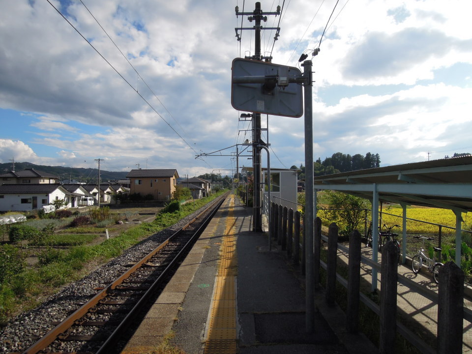 | ホーム上の駅名標がある場所あたりから南方向の駄科駅方面を見る 写真奥方向が南方向で、駄科駅方面(天竜峡・豊橋方面)になります。 |