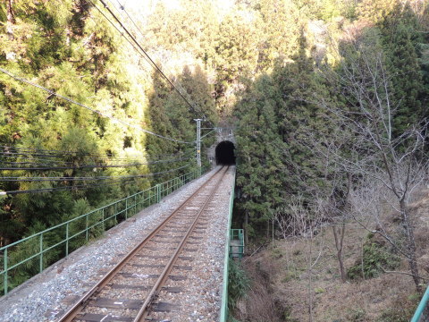 | 中井侍駅の北東側(伊那小沢方)にあるテンポ淵澤橋梁と観音山トンネル 写真奥のほうには「観音山トンネル」(59 延長 710m)が見えています。 私は中井侍駅を訪問後に同駅のことを調べていて初めて知ったのですが、写真に見える「観音山トンネル」の左側(北側)には、現在は放棄されて廃線となった旧「観音山トンネル」(観音山隧道 延長 530m)があり、現在でもそのトンネル入口が残っているそうです。 残念ながら上の写真では、その姿を見ることができません。 中井侍~伊那小沢間の旧線から新線への切り替えは1975年(昭和50年)9月4日に行われたそうで、その理由は、昭和22年頃(1947年頃)から旧観音山隧道に変状が見受けられるようになり、当初は改築によって対応したようですが、その後は剥落が相次ぎ、変状の進行が目立つようになったため、最終的には山側に現在の「観音山トンネル」が新設されるようになったのだそうです。 |