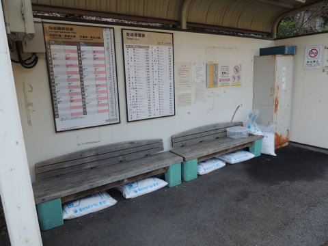 | ホーム上に設置された待合所の様子 中井侍駅のホーム上のやや小和田寄り(中部天竜・豊橋方)には、待合所が設置されています。 待合所には長椅子(ベンチ)、時刻表、普通運賃表などが設置されていて、長椅子の下には凍結防止剤および融氷雪用と思われる塩化カルシウムの袋も置かれていました。 |