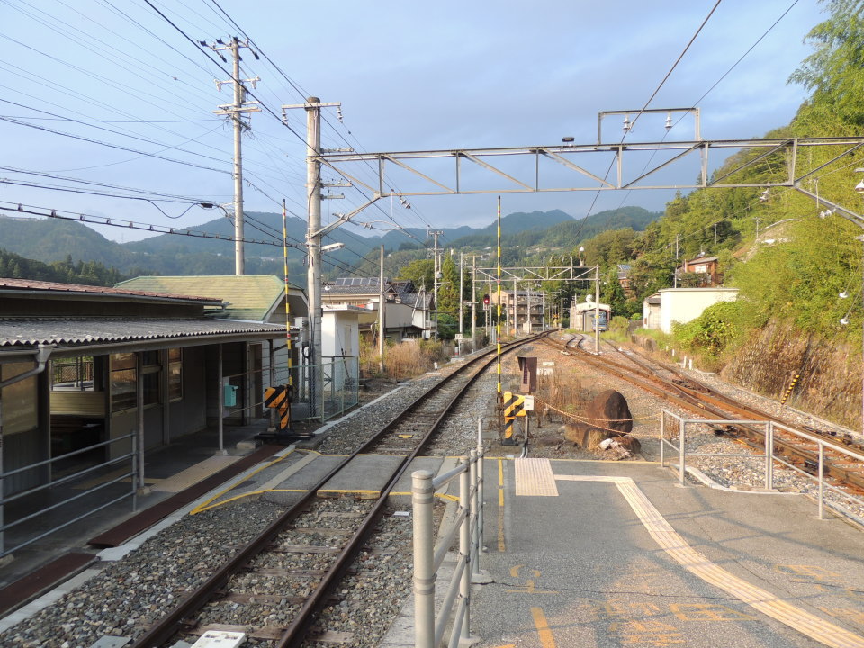 | ホーム南西端側から田本駅方面を見る 写真奥方向が北東方向で、田本駅方面(天竜峡・飯田方面)になります。 写真左端奥の遠方に見える山上(山頂部分)には、少しわかりにくいですが、泰阜村立泰阜小学校の建物が見えていて、秘境駅として知られる田本駅は、ちょうどその小学校の真下のほうにあります。 なお、泰阜小学校のすぐ隣には、泰阜村立泰阜中学校もあります。 |