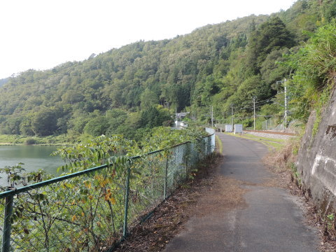 天竜橋の東側入口付近から為栗駅方面を見る 天竜橋を天竜川の左岸(東側)に渡ると、北方向の為栗駅へ向けて小道が整備されています。 為栗駅は、写真の小道を写真奥のほう(北方向)へ約150mほど進んだところにあります。 繰り返しになってしまいますが、果たしてこの為栗駅まで続く小道が、かつての竜東線をそのまま再整備したものであるかどうかは、現時点では不明です。 |