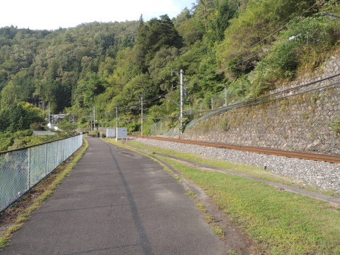 | 我科駅跡周辺の様子 写真左側に見える踏切が我科駅跡の北方(温田・飯田方)約100mあたりのところにある「我科踏切」で、写真右側には「泰阜変電所」が見えています。 我科駅跡は、上の写真に見える泰阜変電所の向こう側あたりにあります。 |