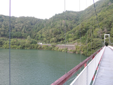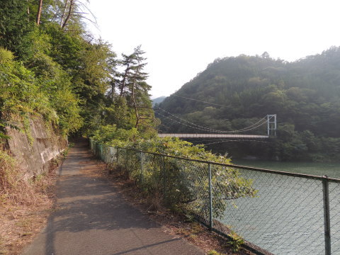 | 為栗駅へ向かう小道の途中で南方向を振り返る さきほど渡ってきた、天竜川に架かる吊り橋「天竜橋」が見え、天竜川と樹々の緑が織り成す美しい風景を目にすることができます。 |