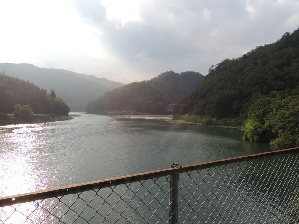 | 天竜橋から「信濃恋し」のある南方向を見る 写真奥方向が南方向で平岡駅方面(中部天竜・豊橋方面)になります。 写真の奥のほうの、為栗駅の南西側を流れる天竜川は上空から見るとS字形のように大きく南北に屈曲していて、「信濃恋し」と呼ばれることで知られています。 「信濃恋し」と呼ばれるようになった経緯にはいくつかのエピソードや昔話があるようですが、天龍村役場の公式サイトの観光情報によると、かつて平岡ダムができる以前に、筏に乗った船頭が飯田方面からこの天竜川のS字の急流に入った際に、筏の向きがあたかも「信濃の国が恋しい」と訴えるがごとく、今来た方向の上流方向へ否応なく向いてしまい船頭泣かせだったことから、いつしか「信濃恋し」と呼ばれるようになったそうです。 |