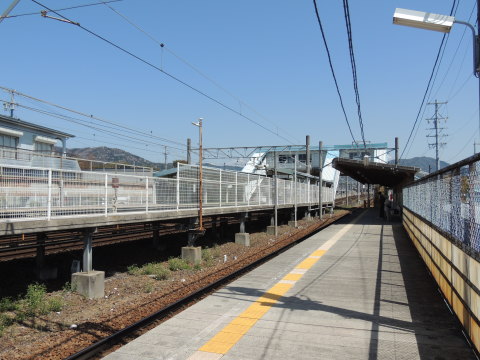 ホームの様子(東方向を見る) ホーム中ほどから東方向を見たもので、写真奥方向が蒲郡駅方面になります。 写真左側(北側)には、当駅に隣接するJR三河塩津駅が見えていて、写真奥のほうには当駅とJR三河塩津駅を連絡する跨線橋が見えています。 2022.04.05現在 |