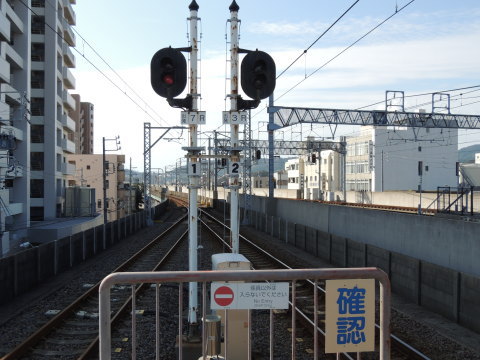 | ホームを西側から見る ホームを西側から見た様子で、写真左側(北側)にJR蒲郡駅のホームが見えています。 また、写真右奥のほうには、蒲郡駅の南東にある、ごま油・界面活性剤などを製造する「竹本油脂株式会社」の大きな本社社屋が見えています。 かつては、蒲郡駅の南口側から、竹本油脂専用の貨物線が延びていたそうです。 2018.09.23現在 |