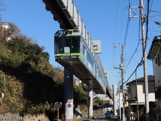 5000系(第3編成) (←写真左) 西鎌倉~湘南深沢間を湘南深沢駅方面(大船方面)へ行く、5000系(第3編成・先頭車両[5605])です。 写真左奥のほうには、西鎌倉駅方面へ続く湘南モノレールの軌道が見えています。 2014.12.18[11:03]現在 |